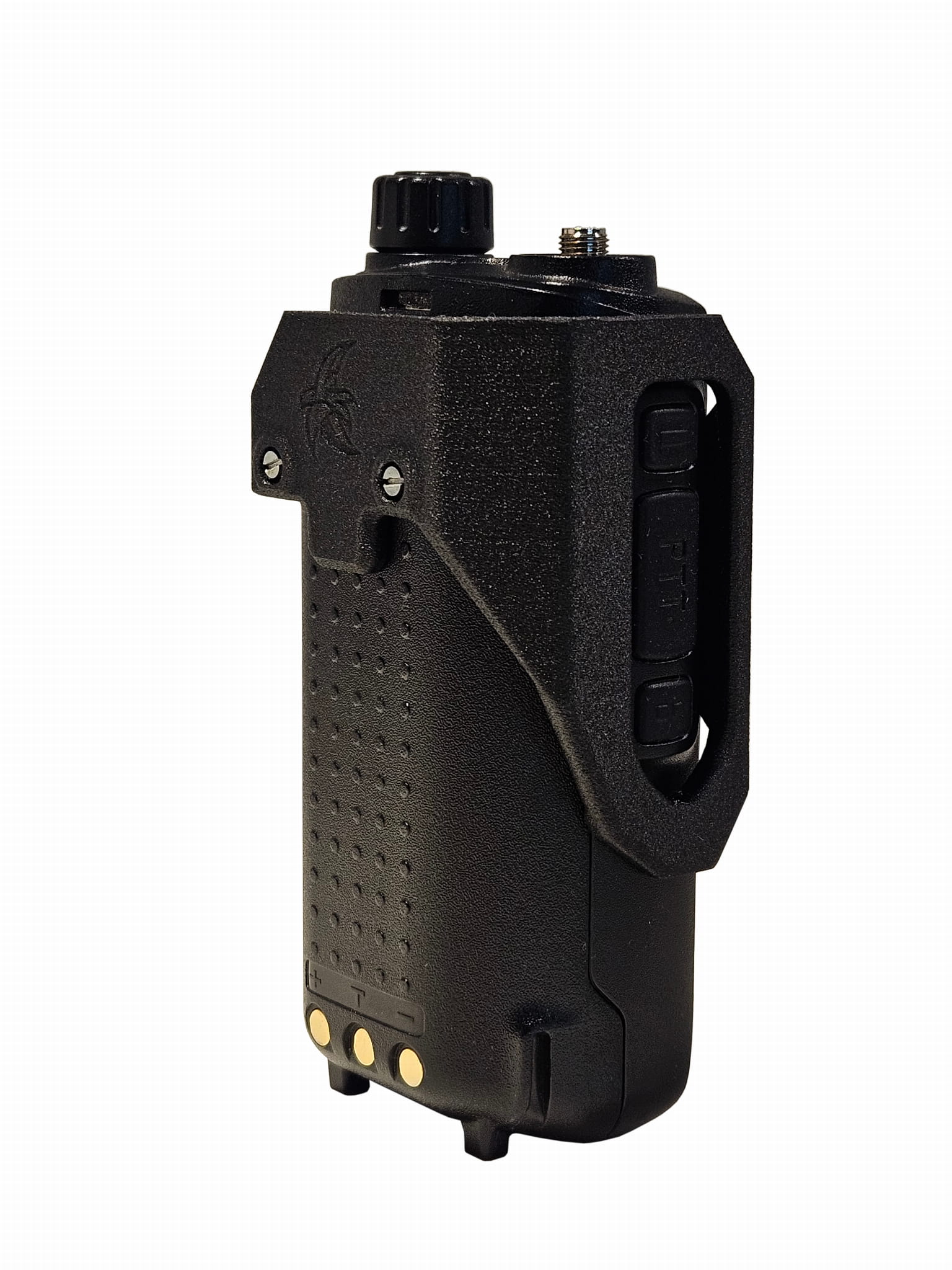 Egzoszkielet został wykonany z niezwykle wytrzymałego nylonu zbrojonego włóknem węglowym, co zapewnia jego trwałość i odporność na uszkodzenia mechaniczne. Dzięki zastosowaniu druku 3D w technologii FDM, każdy element jest precyzyjnie dopasowany do radiotelefonu, gwarantując pewne osadzenie i niezawodność w trudnych warunkach.